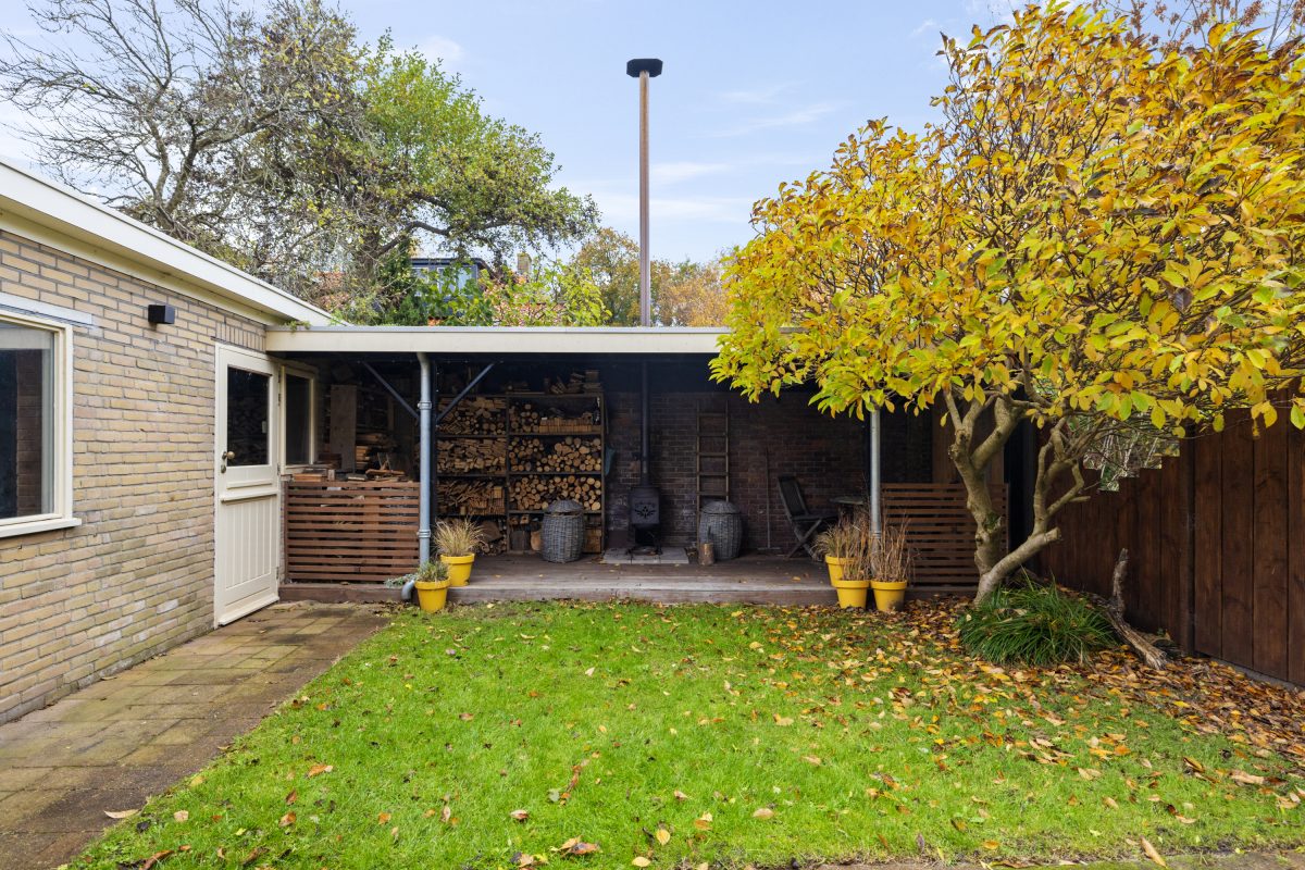 Achtertuin op het noordwesten met veranda achterin. In 2023 zijn de oprit, tuin en drain aangepakt.