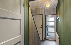 Entree/hal met vernieuwde indeling (deuropening verplaatst), meterkast en toilet. Lichte woonkamer met houtkachel (recent vernieuwd; kan worden overgenomen).