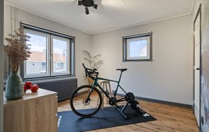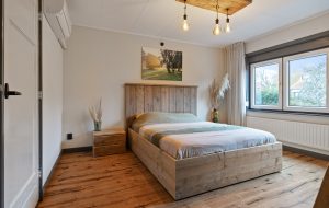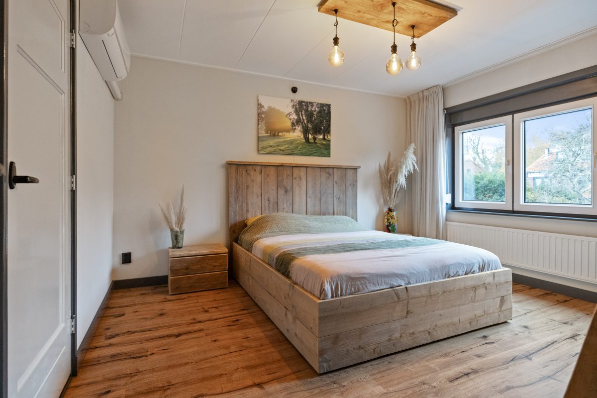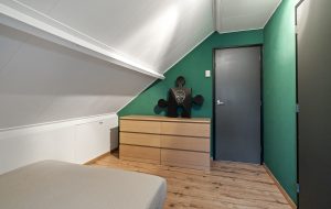Drie kamers, waaronder een achterkamer (nu ingericht als waskamer) met tuindeur naar het dakterras. Aircounit en rolluik zijn geplaatst bij de achterslaapkamer op de eerste verdieping.