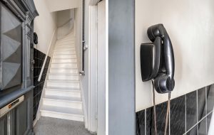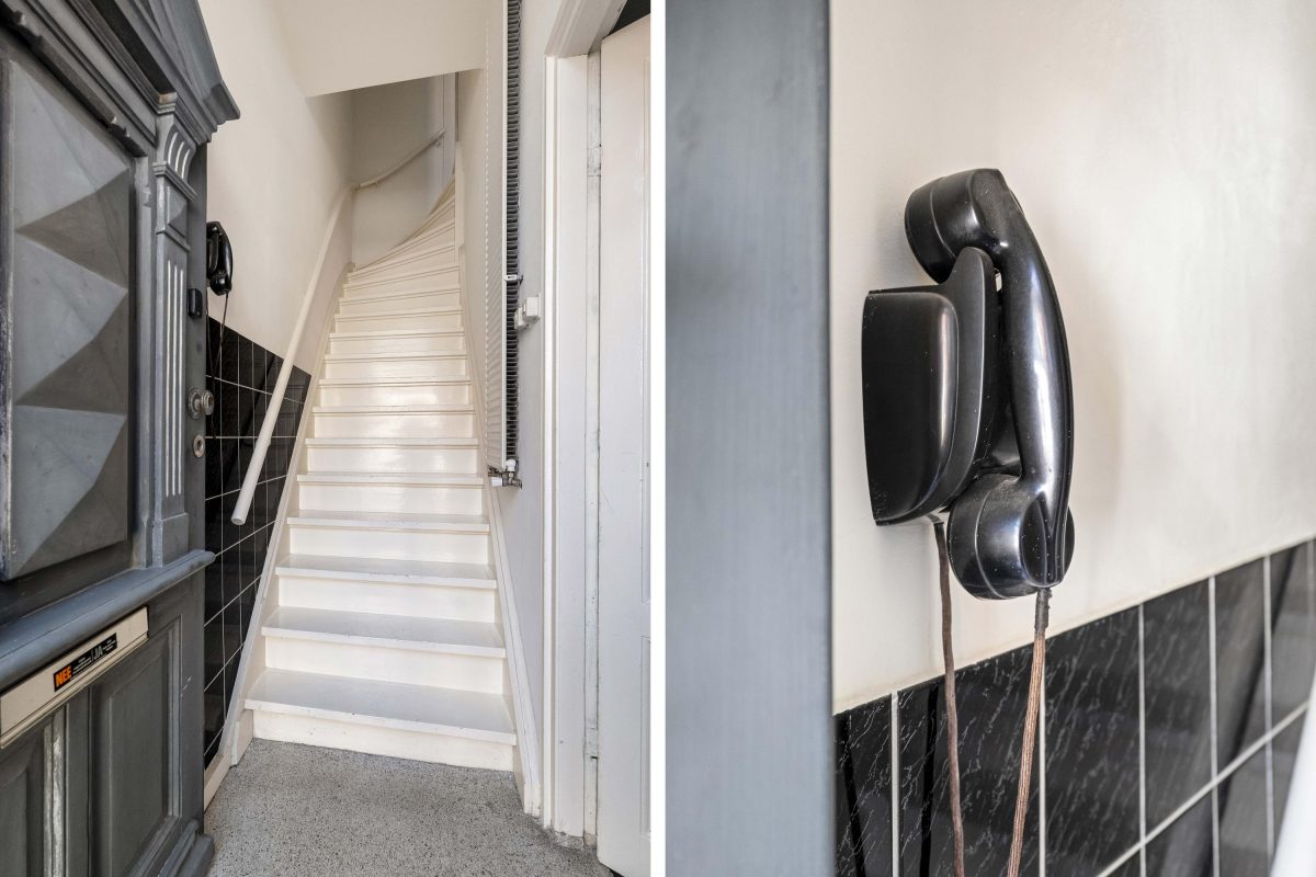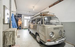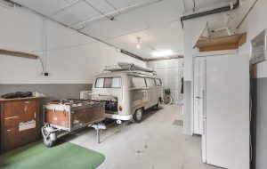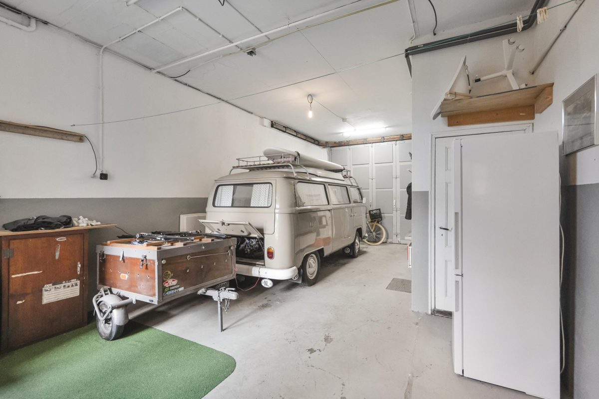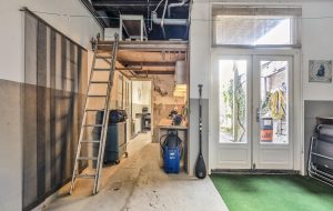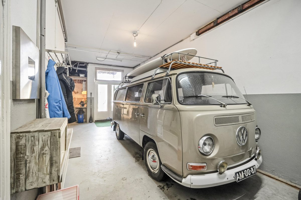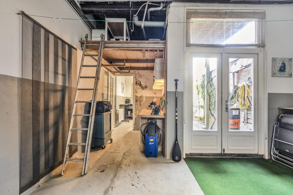 Tevens de entree die toegang biedt tot de verdieping via de karakteristieke trapopgang. Ook stap je direct door naar de ruime garage van ca. 41 m². Deze hoge, brede en diepe ruimte is ideaal voor een camper, meerdere motoren, hobby, opslag of een atelier/kantoor aan huis.