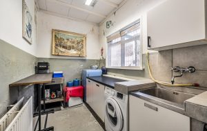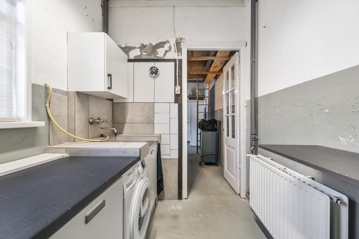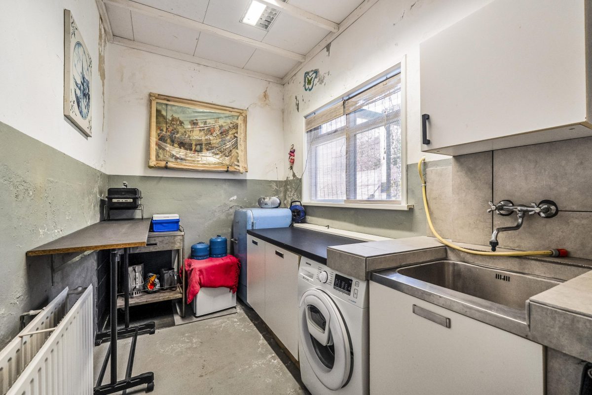 Achter de garage ligt een ruime bijkeuken/wasruimte met grote spoelgelegenheid en aansluitingen voor witgoed. Onder de trap bevinden zich nog een bergkast en de meterkast.