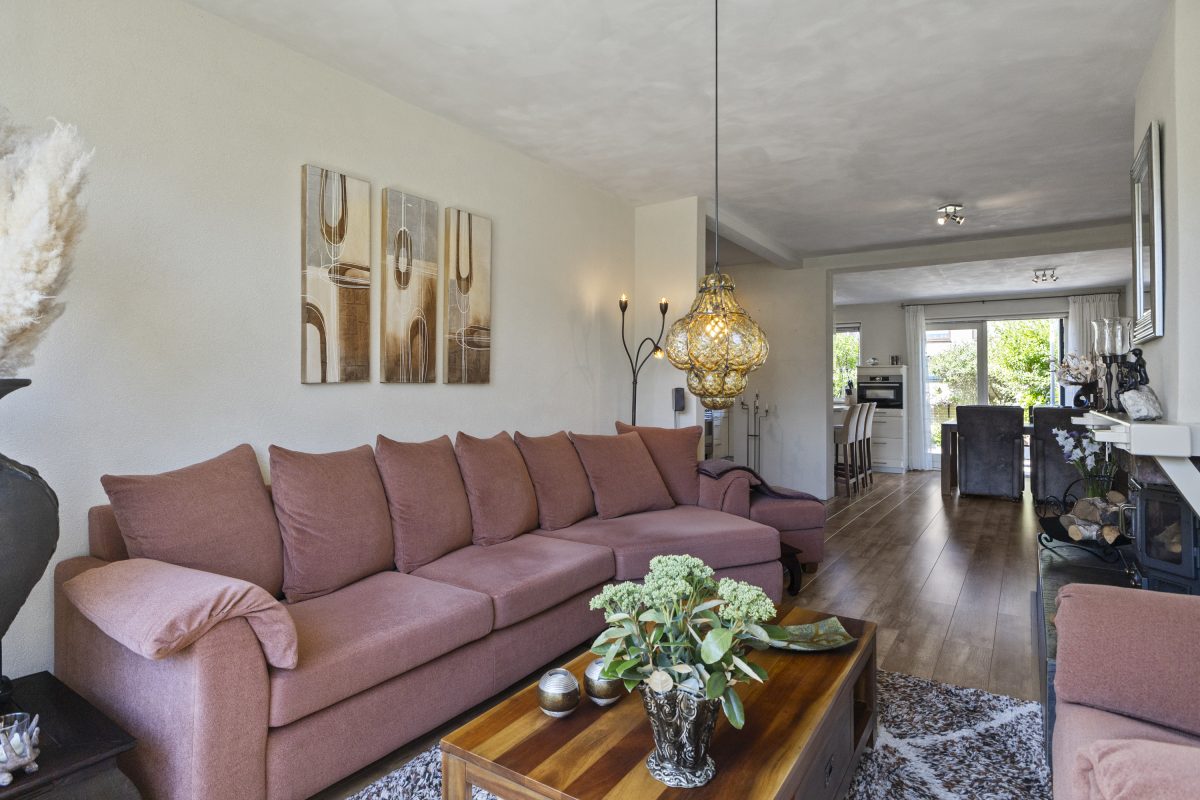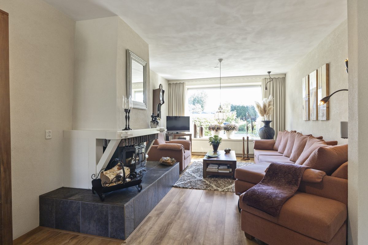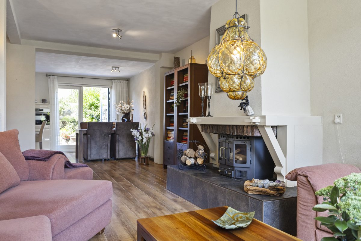 De woning zelf biedt verrassend veel ruimte! De doorzonwoonkamer is licht en sfeervol, met een warme houten vloer en een karakteristieke schouw met allesbrander die direct de aandacht trekt.