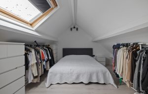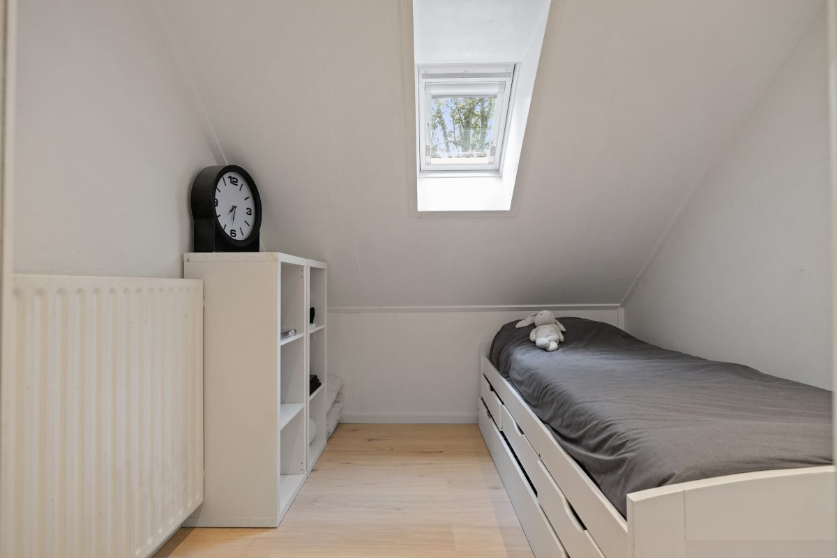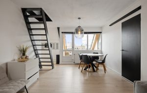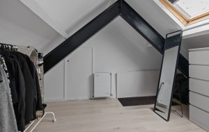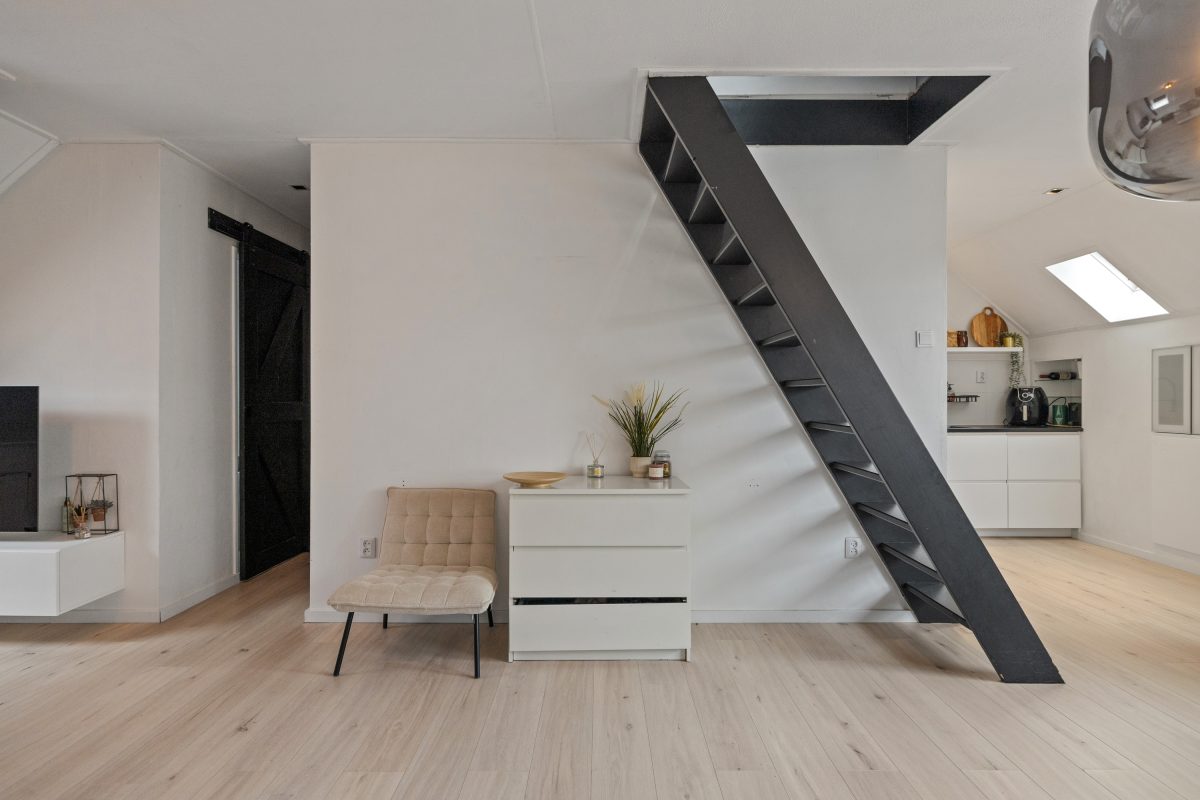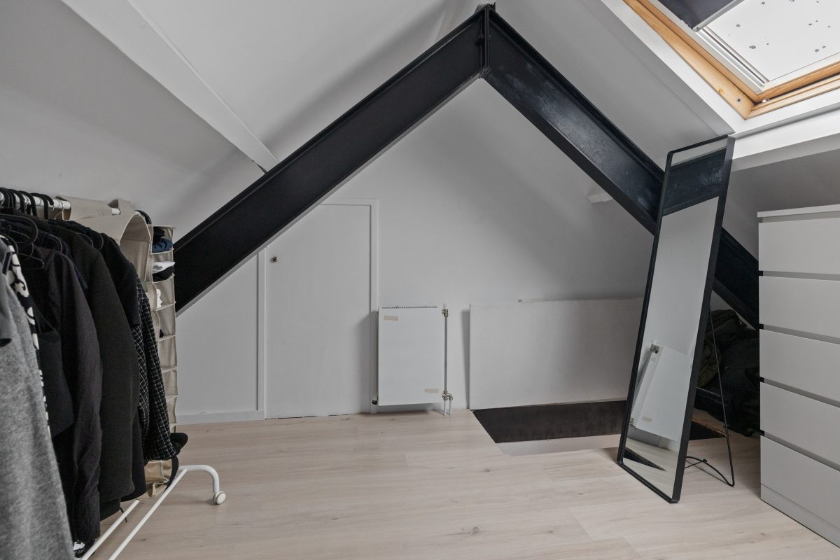 Via de open trap bereik je de tweede verdieping: een royale zolderslaapkamer met extra bergruimte, waardoor dit appartement verrassend veel wooncomfort biedt.