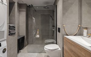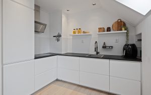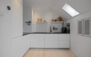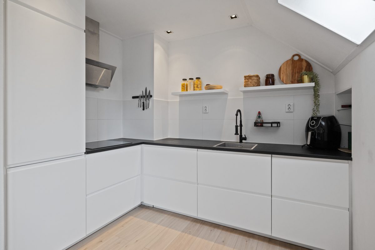 De moderne keuken is uitgerust met diverse inbouwapparatuur, waaronder een inductiekookplaat, vaatwasser, koelkast en oven. Op deze verdieping bevindt zich tevens een slaapkamer met dakraam en de ruime badkamer voorzien van douche, wastafel, toilet en aansluitingen voor wasmachine en droger.