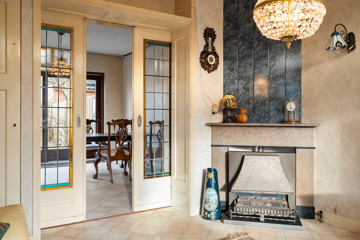 Entree/hal, woonkamer met originele glas-in-lood ramen aan de voorzijde, een gashaard en en suite-deuren (eveneens met glas-in-lood). Aansluitend een eenvoudige keuken met toegang tot de achtertuin.
