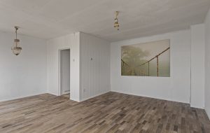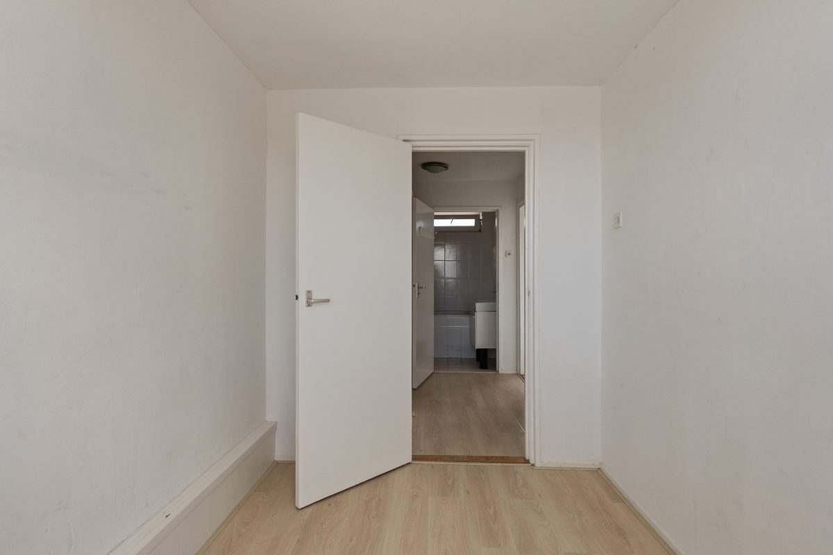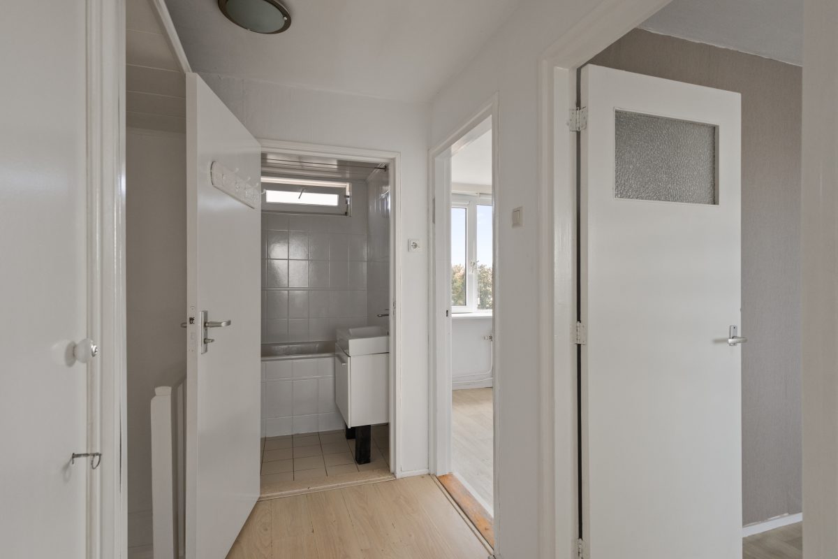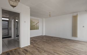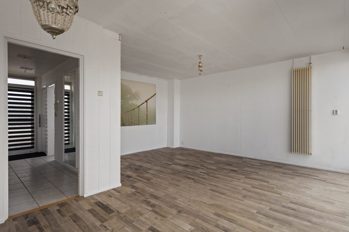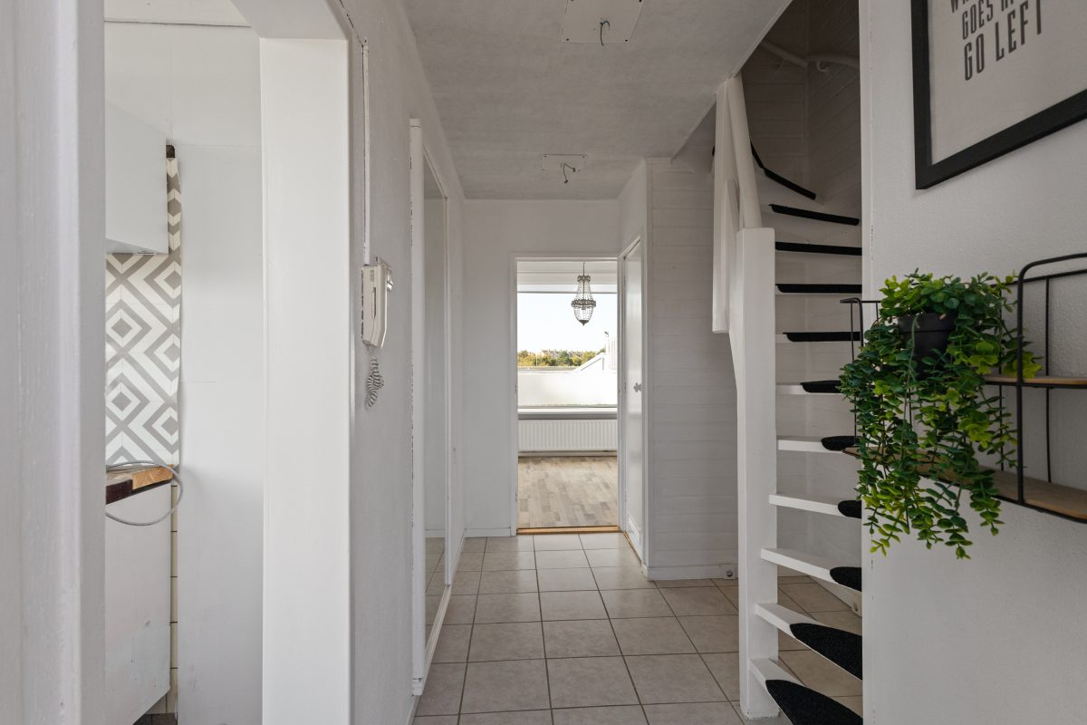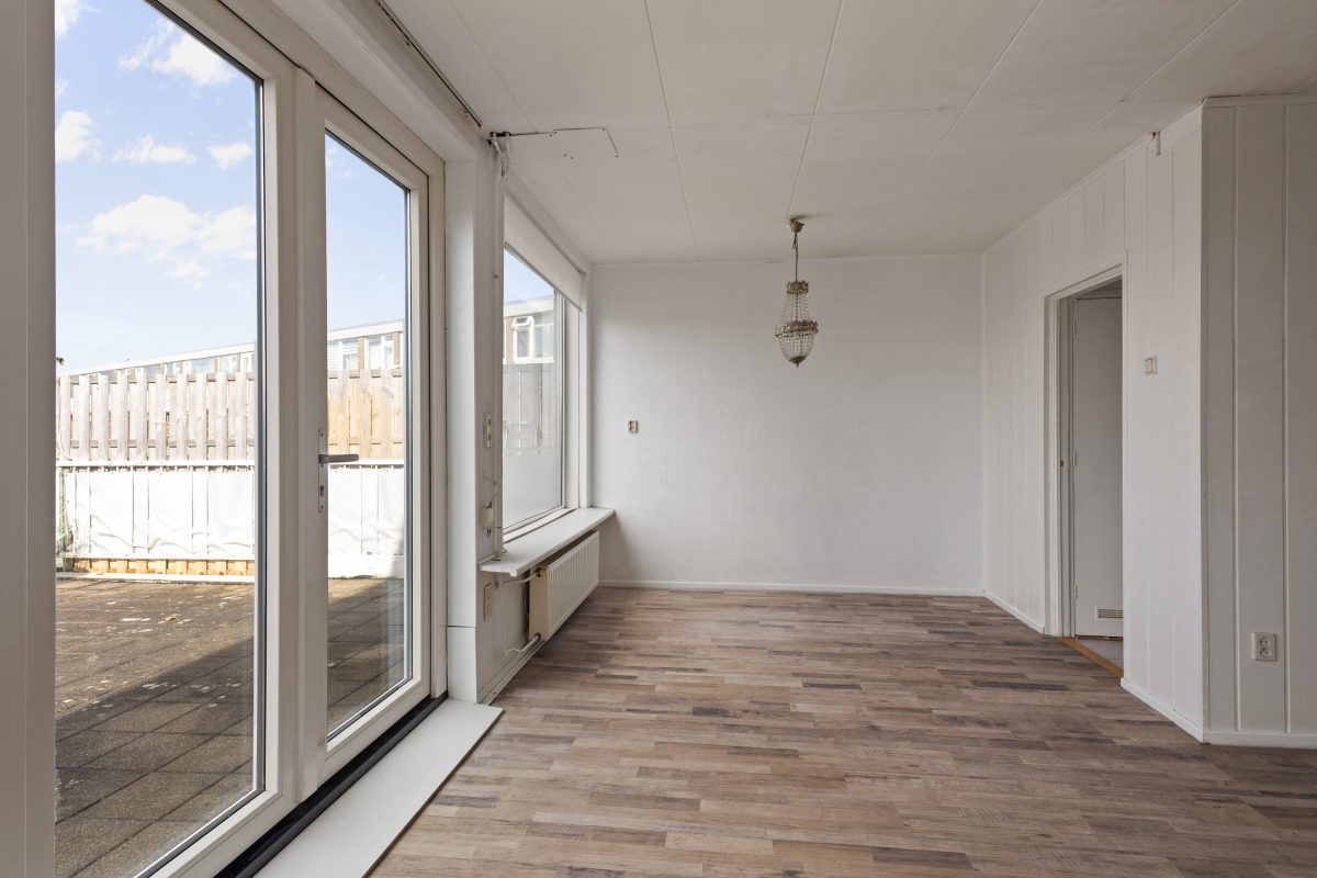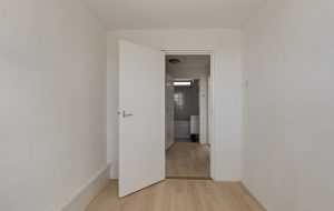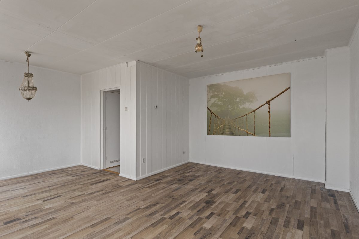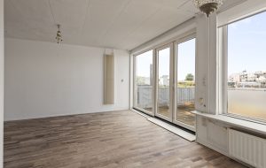 Entree/hal, meterkast, keuken aan de voorzijde (galerij), lichte L-vormige woonkamer met laminaatvloer en lichtgekleurde wanden en plafond en toegang tot het royale dakterras van 28 m² op het westen.