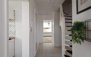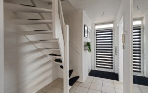 Verder een tussenhal met toiletruimte en trapopgang naar de tweede verdieping.