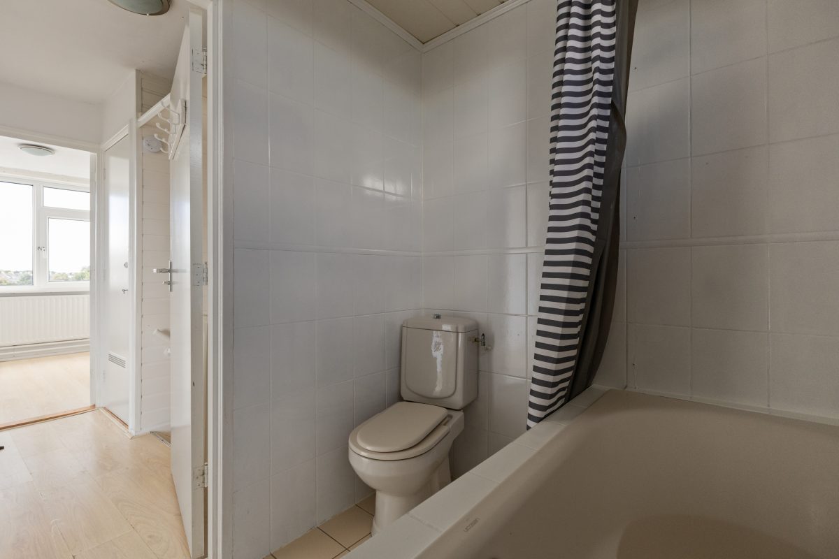 Ruime overloop, drie slaapkamers en een badkamer met wastafelmeubel, douche/ bad-combinatie en 2e toilet.