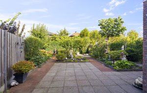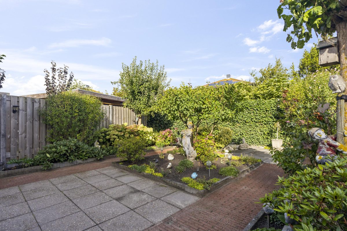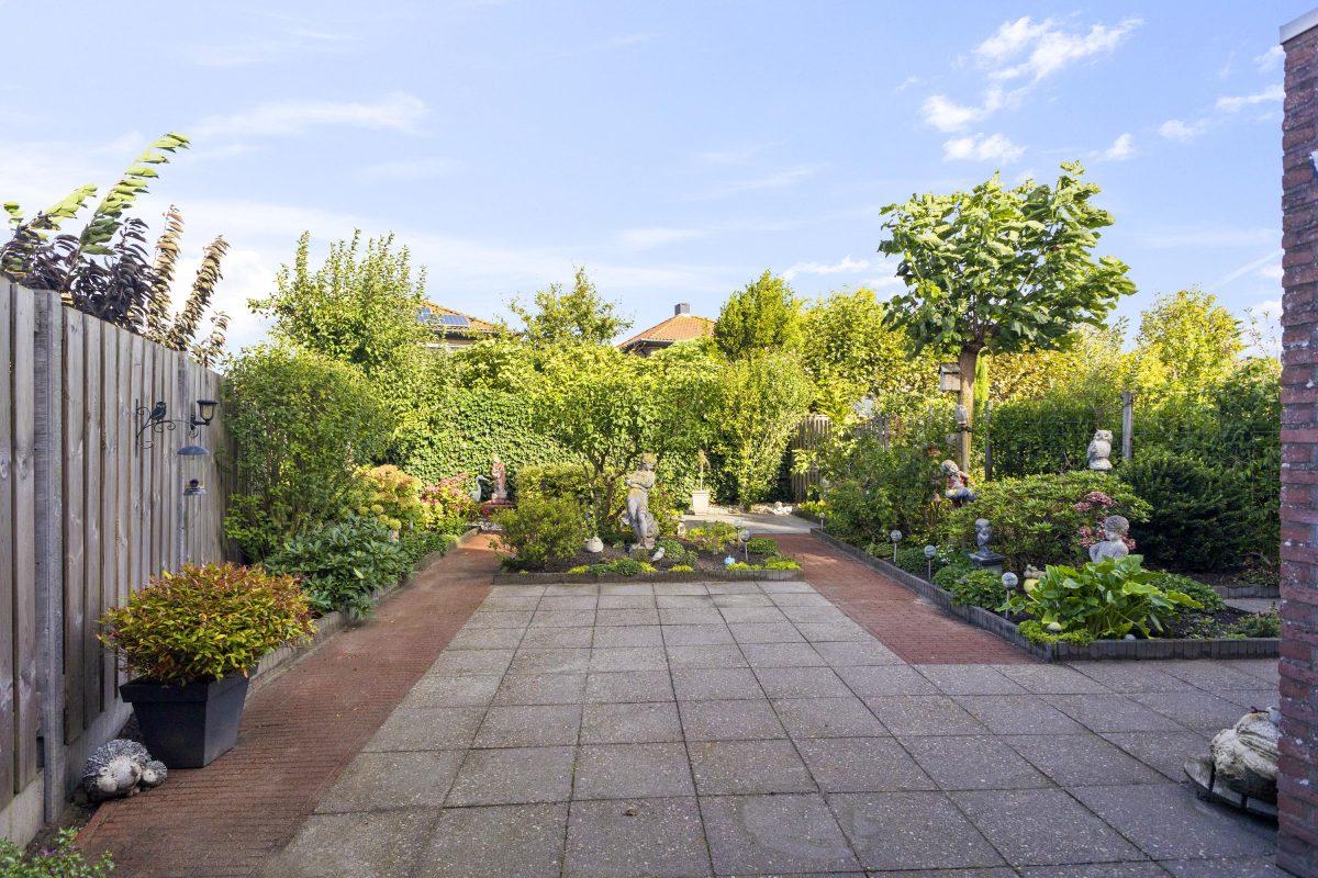 De fraai aangelegde achtertuin op het noordwesten is ruim en voorzien van veel groen, borders en meerdere zitplekken. Dankzij de grootte van de tuin kun je op ieder moment van de dag kiezen voor zon of schaduw. Aan de voorzijde beschikt de woning over een eigen oprit met parkeergelegenheid voor 1 à 2 auto’s.