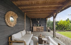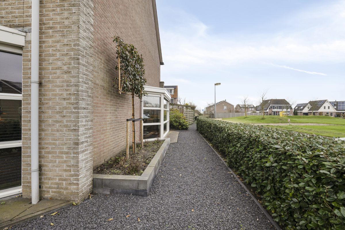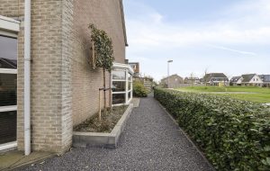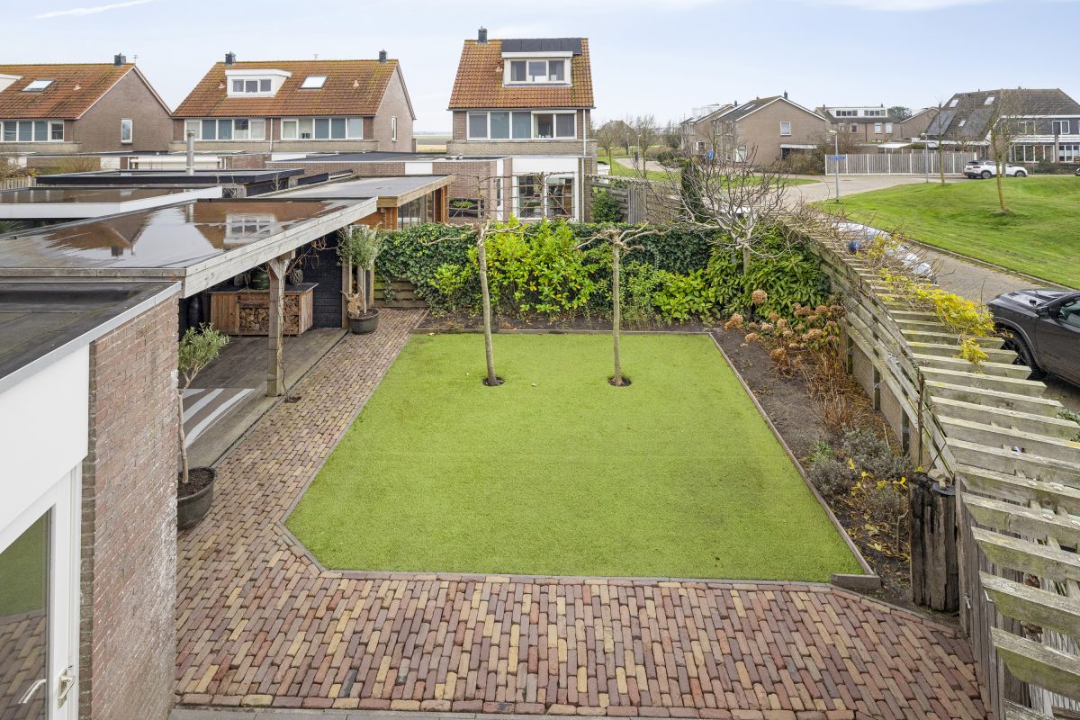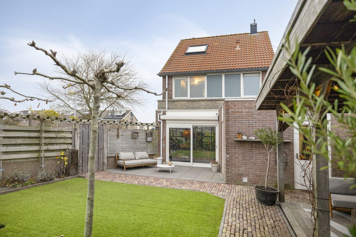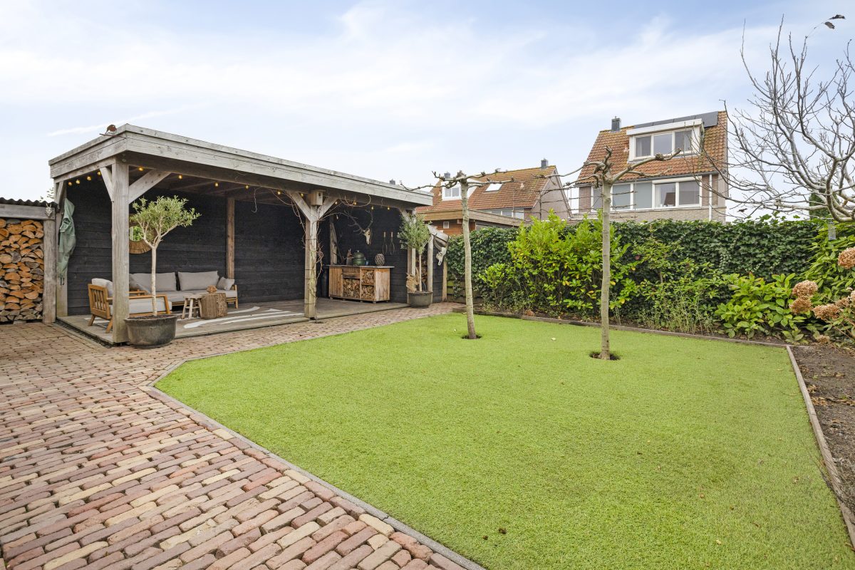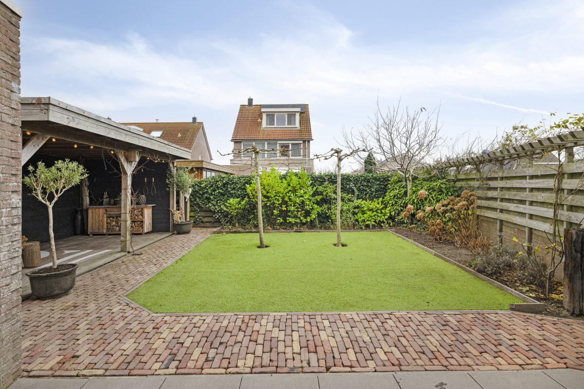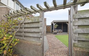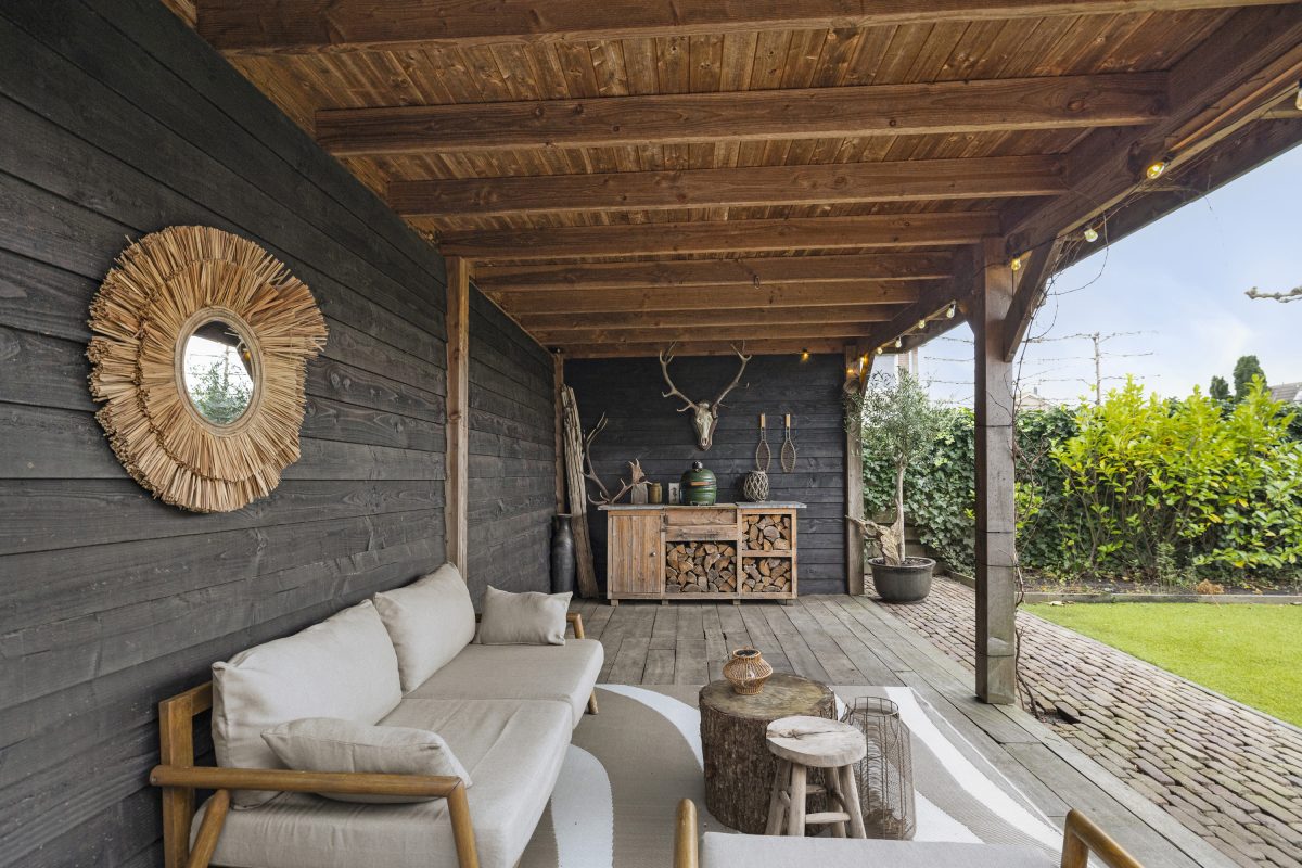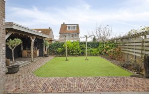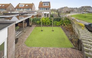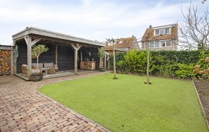 De tuin is verzorgd aangelegd, met een combinatie van bestrating en een onderhoudsarm gazon dat nooit gemaaid hoeft te worden. Onder de overkapping is het bovendien ook in de late uurtjes heerlijk zitten.