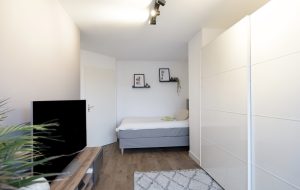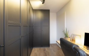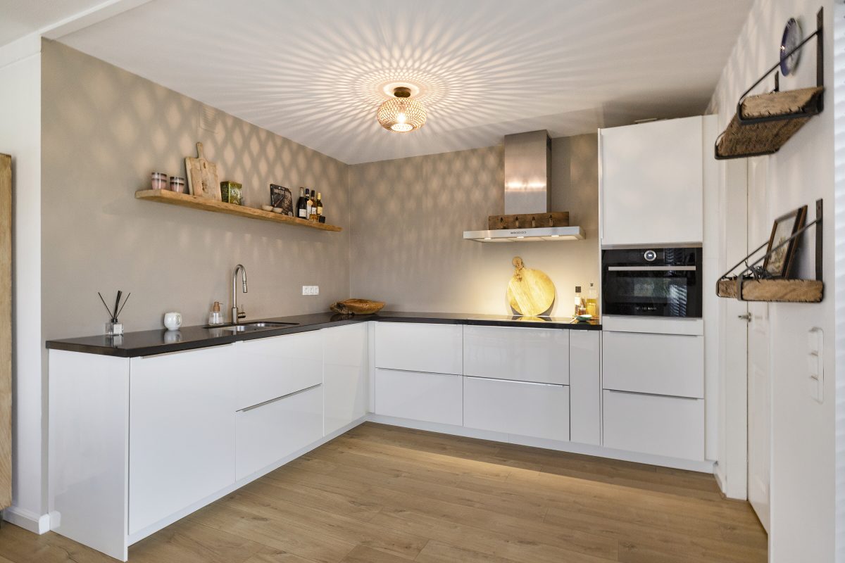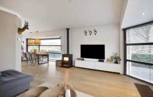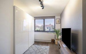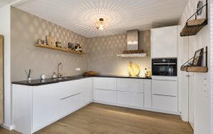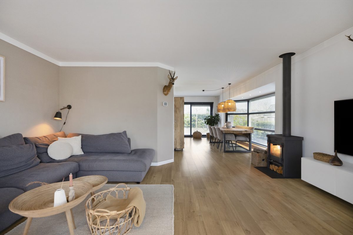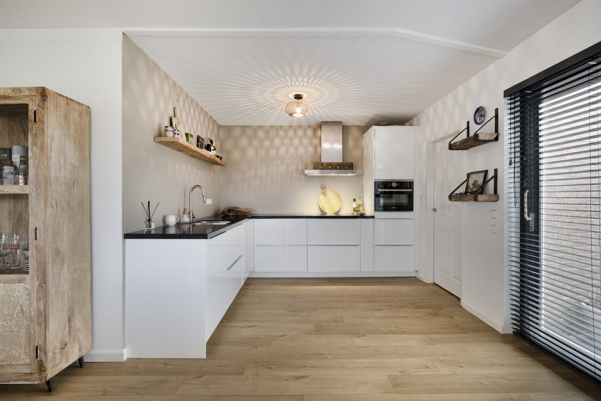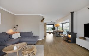 De woonkamer is vergroot ten opzichte van de standaardindeling dankzij een uitbouw over de volledige breedte. Deze zeer royale en lichte leefruimte is keurig afgewerkt met gestucte wanden en voorzien van een moderne keuken.