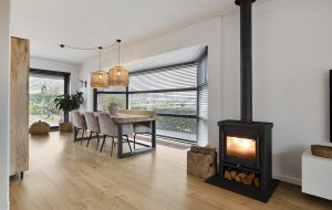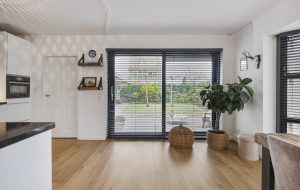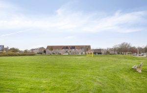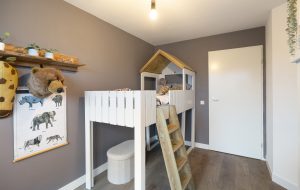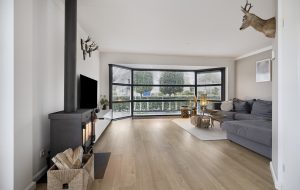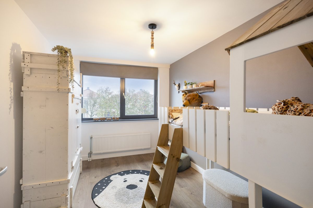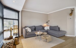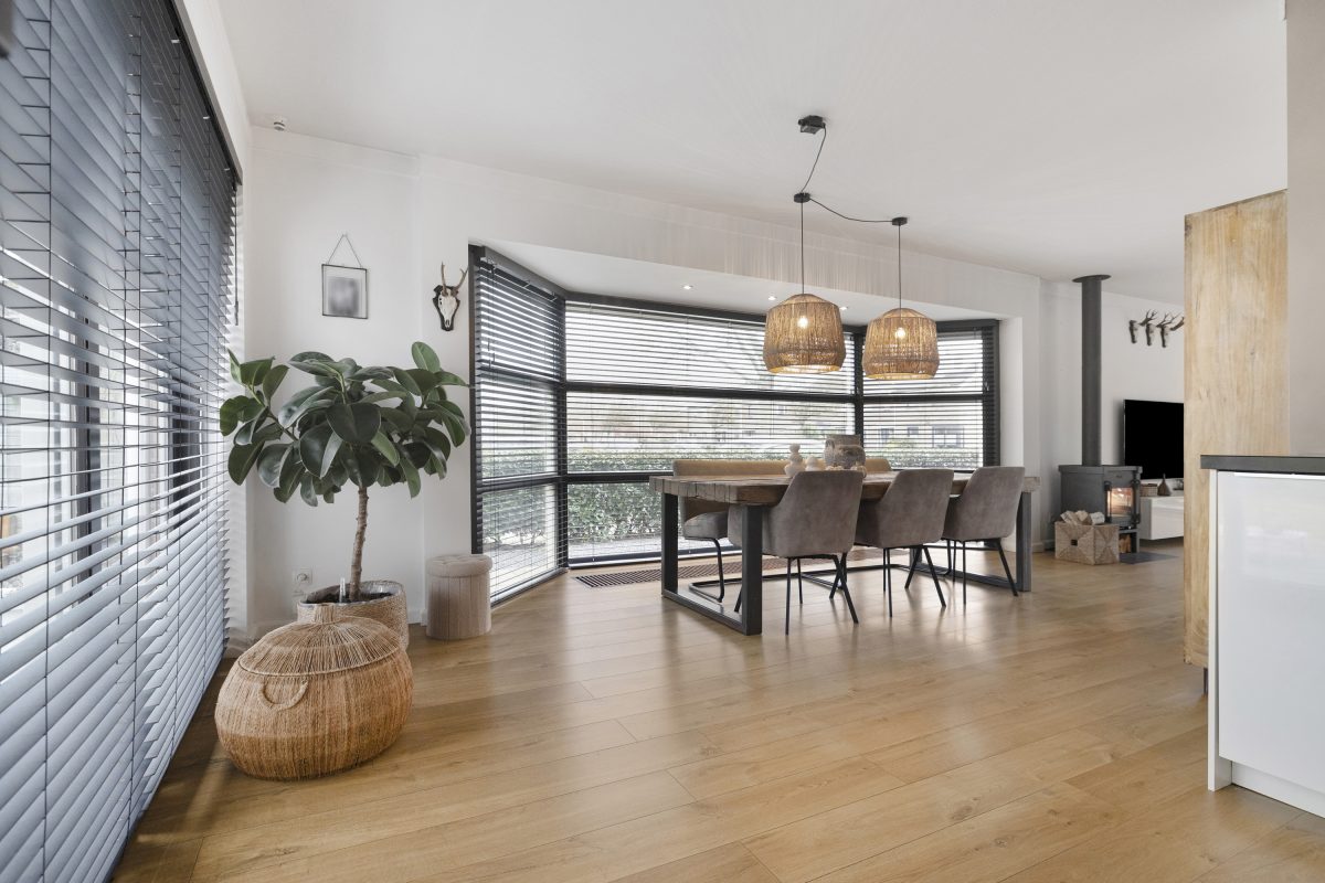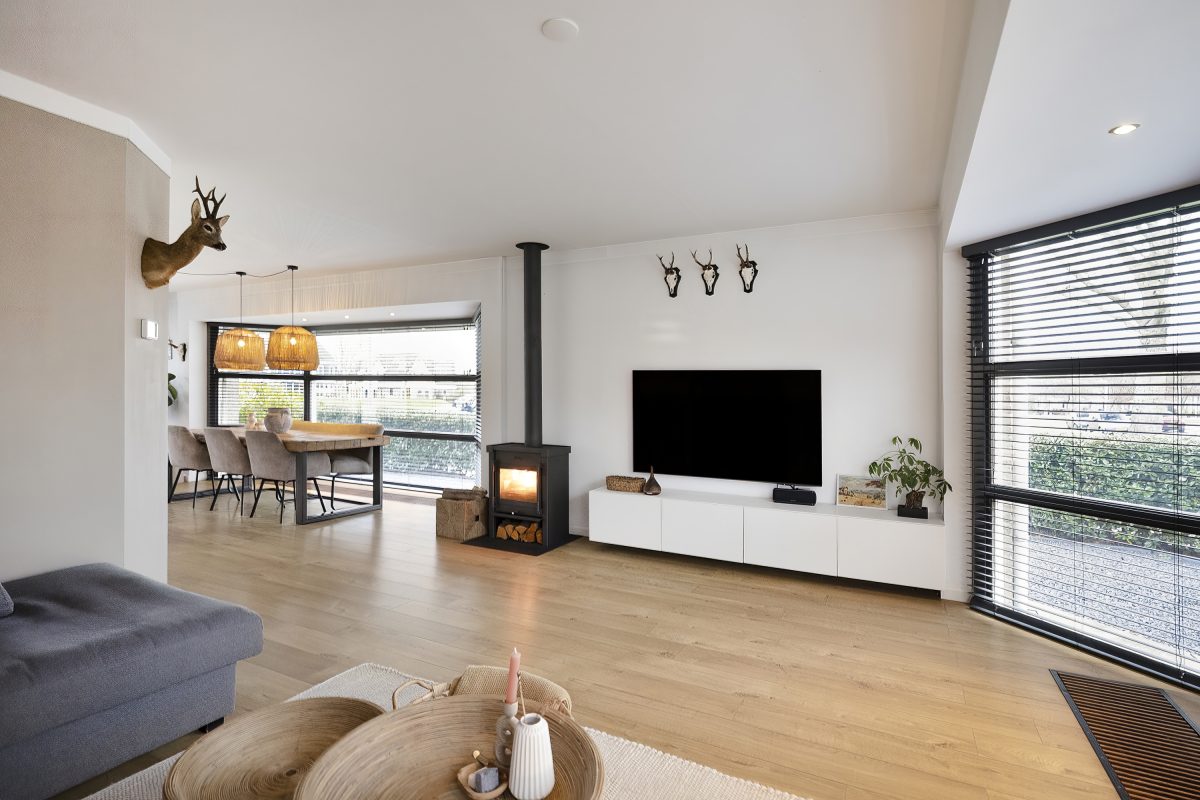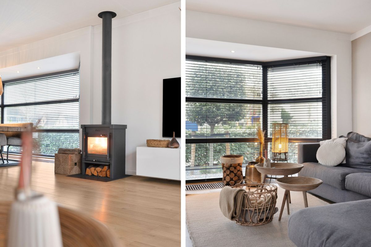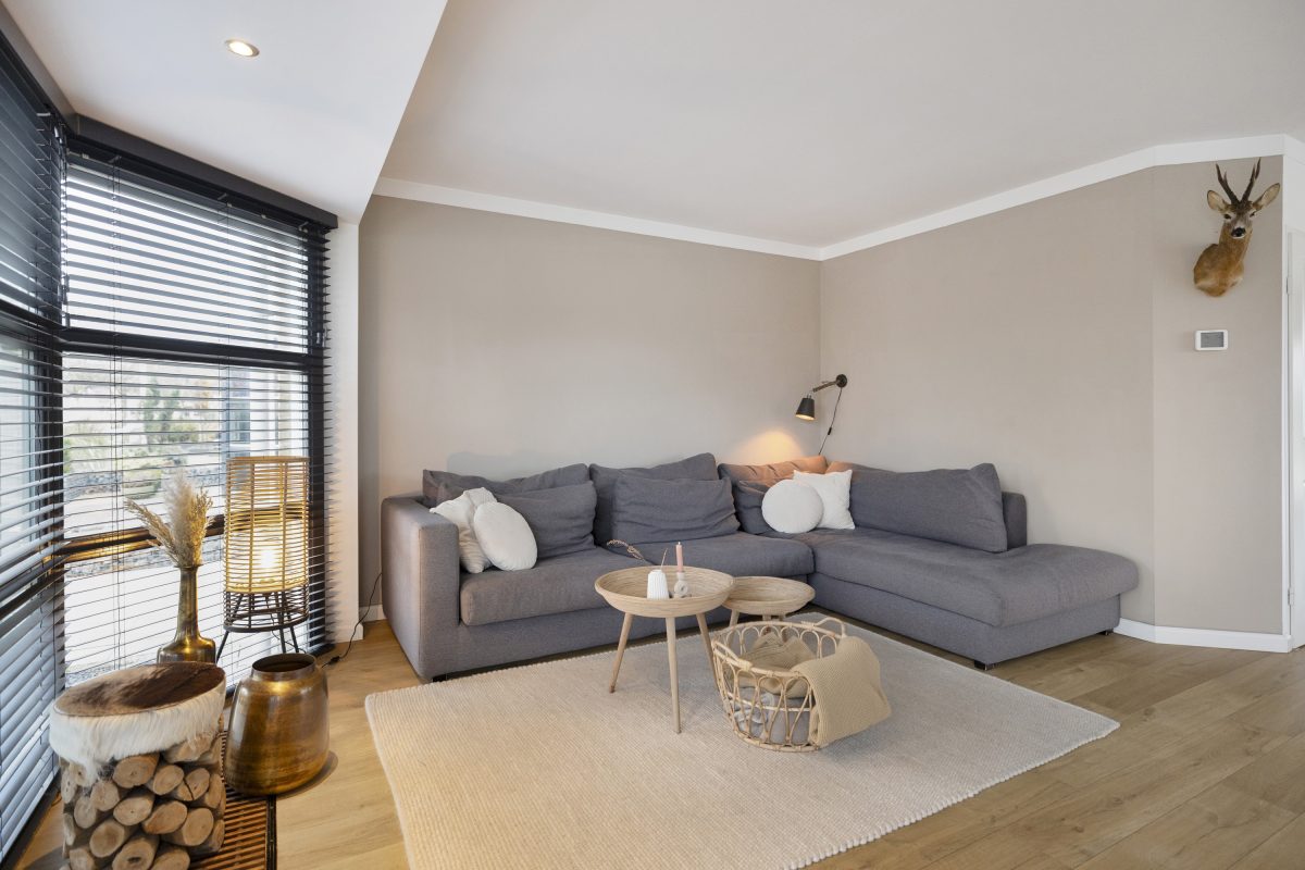 De woonkamer beschikt over twee grote glazen erkers, die zorgen voor een vrij uitzicht over de naastgelegen speelweide én voor een overvloed aan natuurlijk licht in huis!