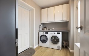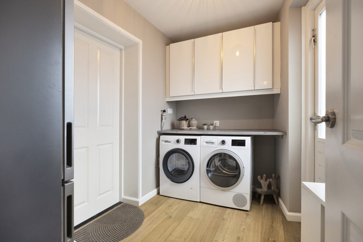 * een praktische bijkeuken met wasmachine en droger aansluiting;