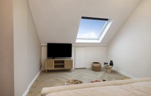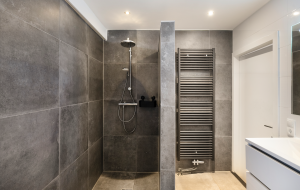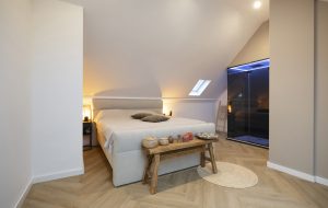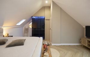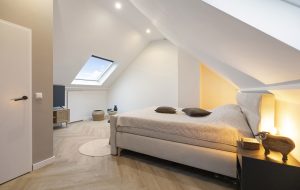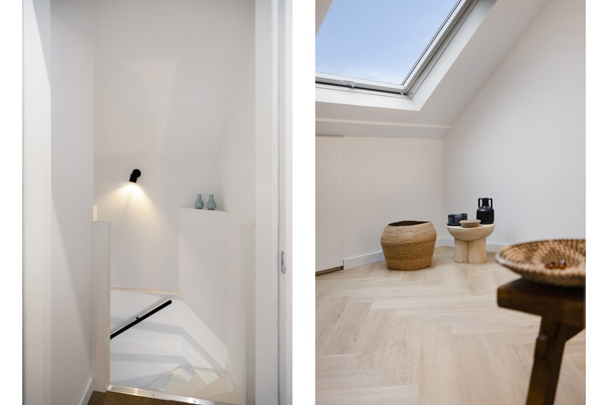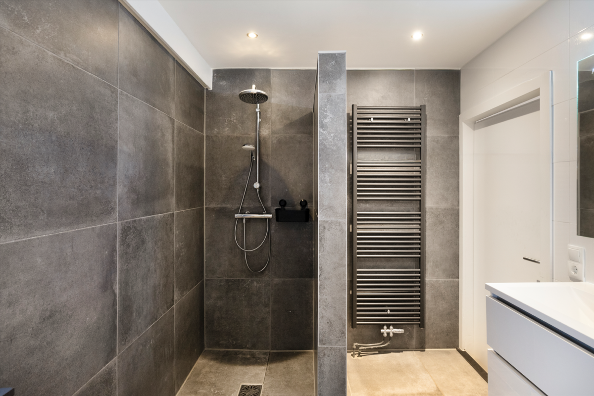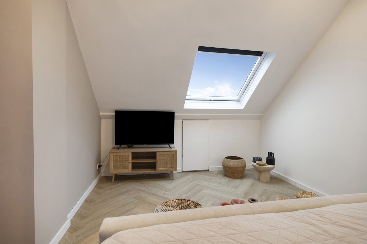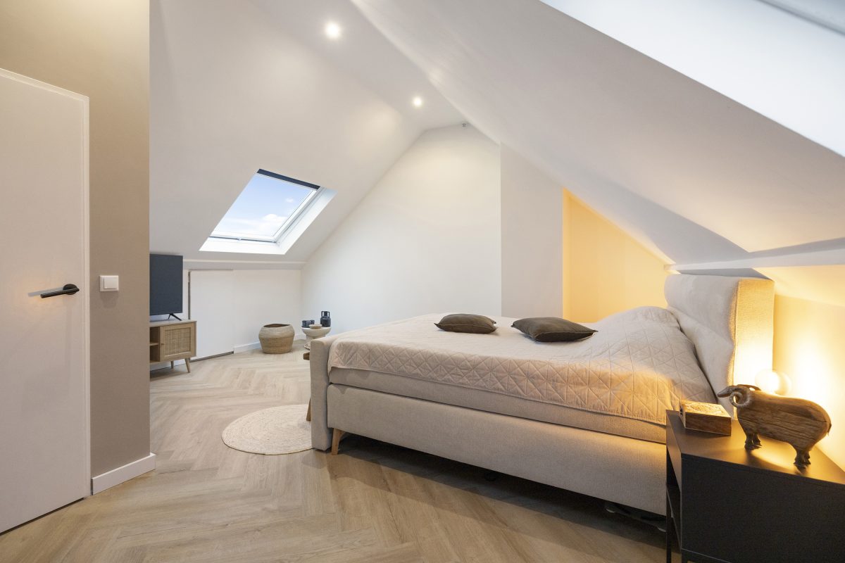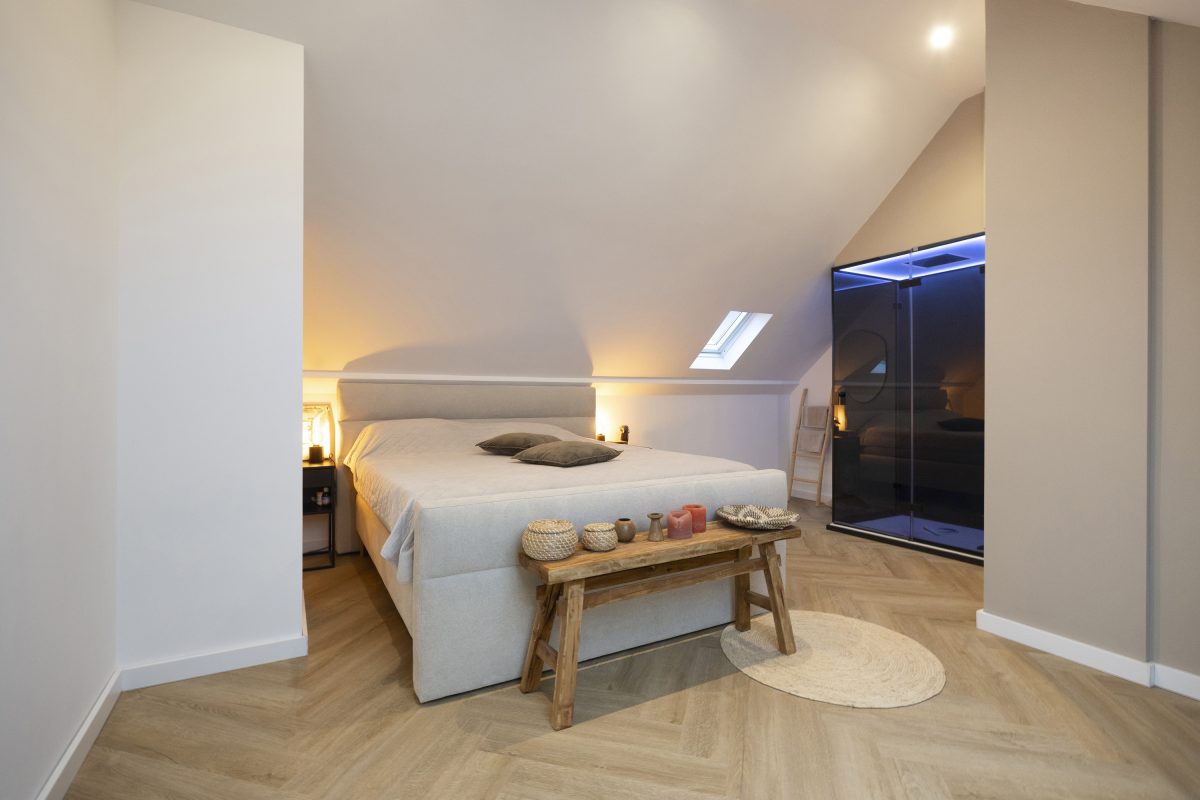 En dan is er nog de zolder, volledig gestuct, afgewerkt met een visgraat pvc vloer en voorzien van een luxe douche.